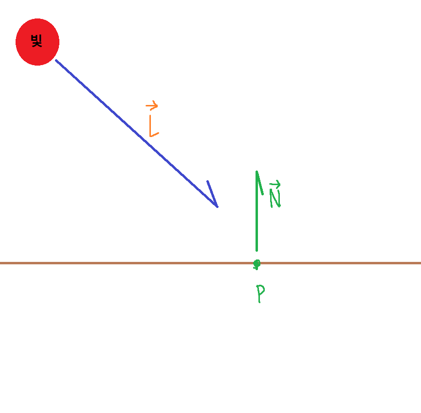 - 어떤 물체의 표면에 빛이 닿으면 노멀 벡터를 기준으로 대칭된 각도로 빛이 튕겨나가게 된다.