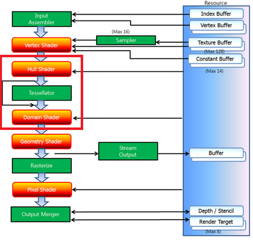- Hull Shader, Tessellator, Domain Shader 단계를 묶어서 Tessellation Stages라고 한다.