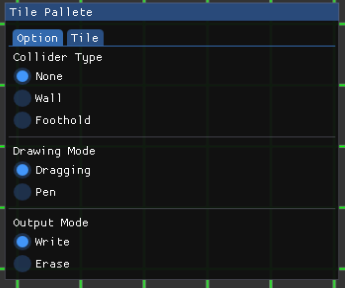 - 현재 TilePallete에서 타일을 선택하는 부분이 있고, 옵션을 선택하는 부분이 있는데(충돌체, 그리는방식(연속,단일) 등등)