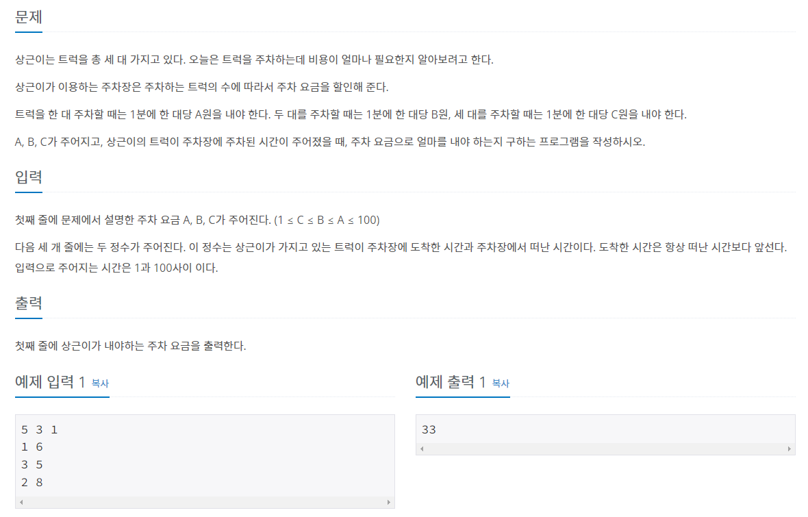 문제의 요지는 주차된 차량 별 3가지 요금을 입력 받아서,주차된 차량이 몇 대냐에 따라 1대 당 요금을 다르게 책정하고최종적으로 발생하는 비용을 물어보는 문제였다.