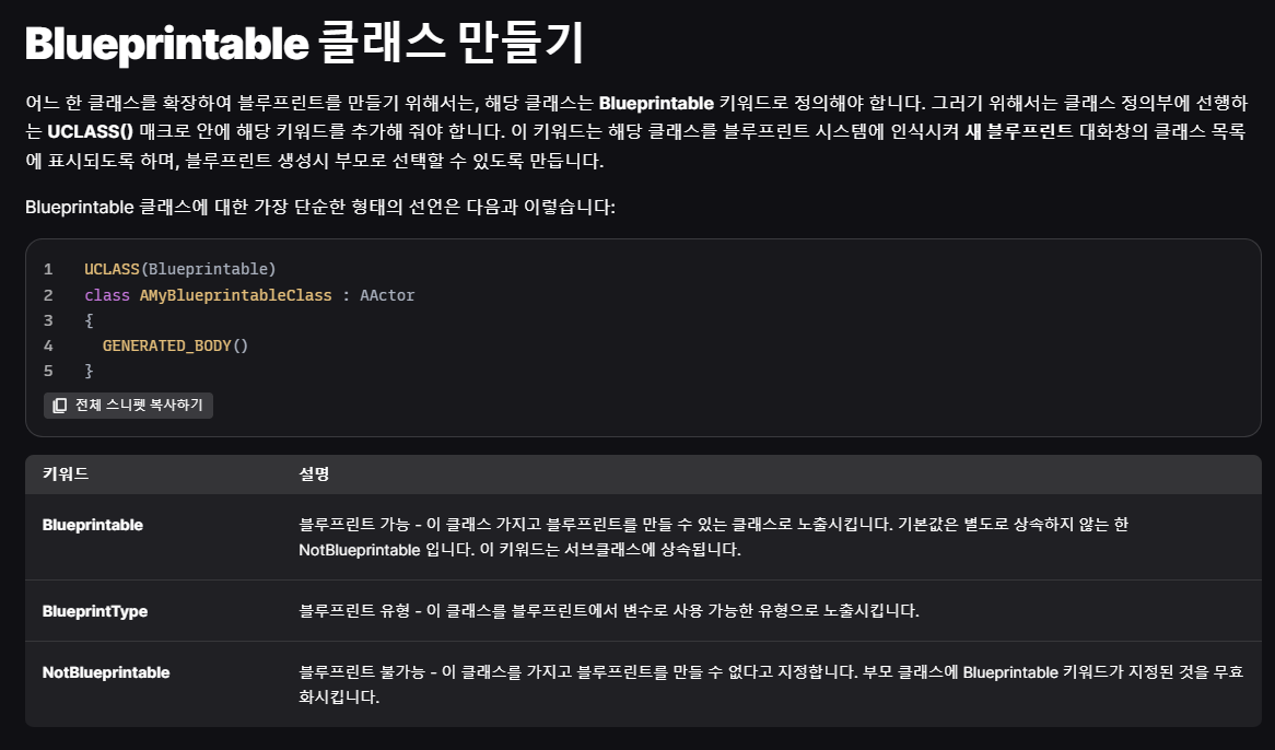- 기억해야 할 점은 이 Blueprintable 키워드가 붙은 클래스를 상속받는 클래스들도 그 영향을 받는다는 것입니다.