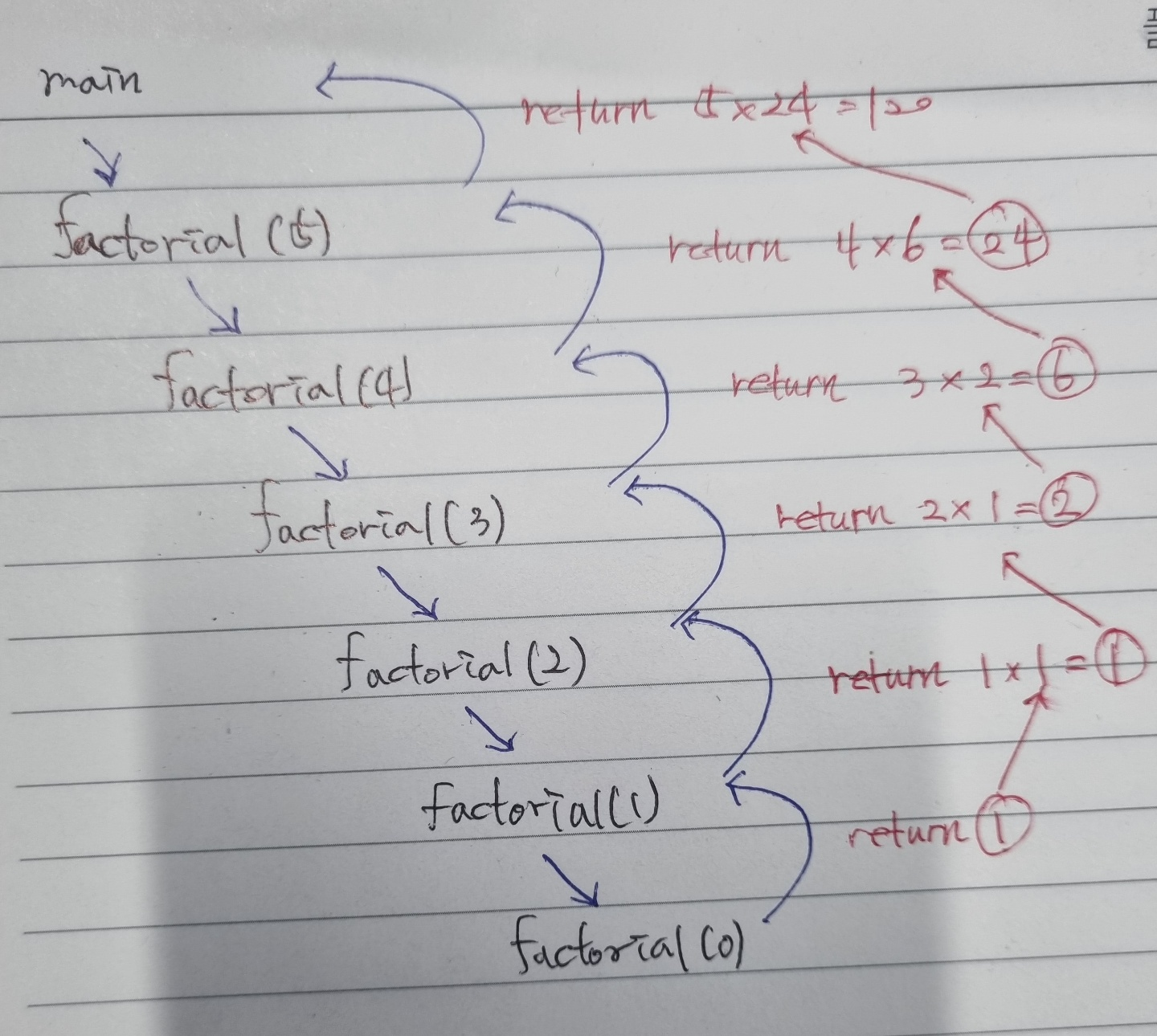 • 새로운 재귀 함수 호출은 화살표로 가리킨다.