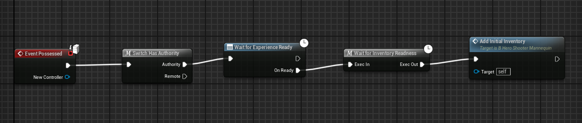 EventPossessed -> Switch Has Authority -> Wait for ExperienceReady -> Wait for Inventory Readness -> Add Initial Inventory