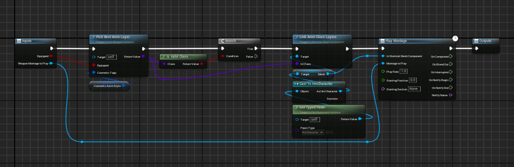 - 그 후 GetTypedPawn을 통해 Character를 가져온 후, 캐릭터의 Skeletal Mesh를 가져와서 Anim Montage를 실행시킵니다.