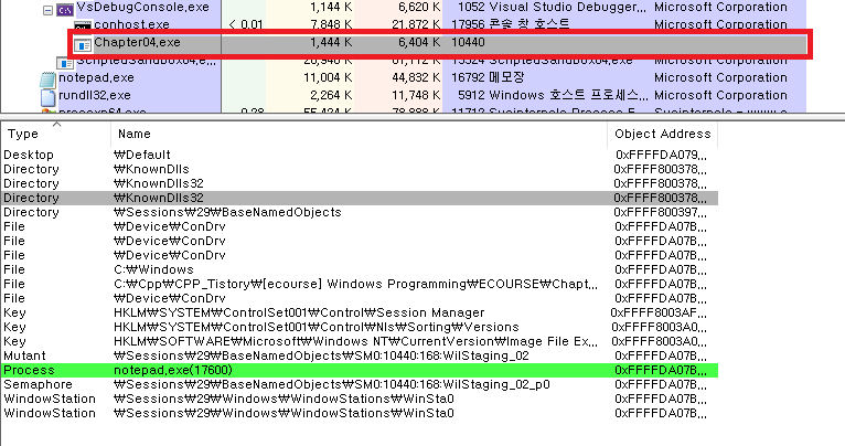 - Process가 커널 오브젝트 테이블에 추가된 것을 확인할 수 있다.
