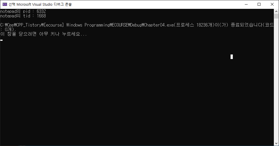 //HWND hwnd = FindWindow(0, L"C:\\Cpp\\CPP_Tistory\\[ecourse] Windows Programming\\ECOURSE\\Debug\\Chapter04.exe");