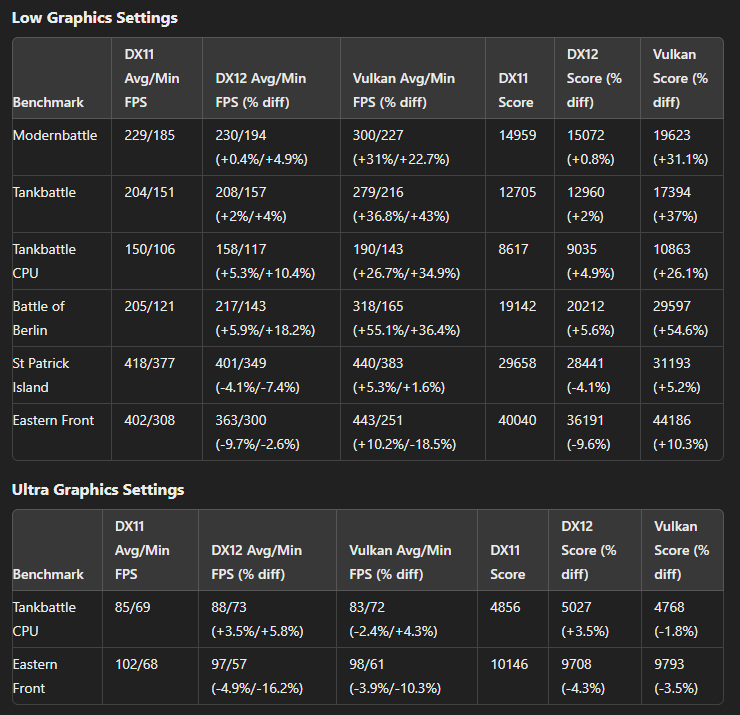 위 벤치마크(2024년)에서는 낮은 그래픽 환경에서 Dx11, Dx12보다 Vulkan이 압도적인 우위를 점하고 있다고 한다.