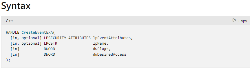 hEvent = CreateEventEx(0, _T("MyEvent"), 0, EVENT_ALL_ACCESS);