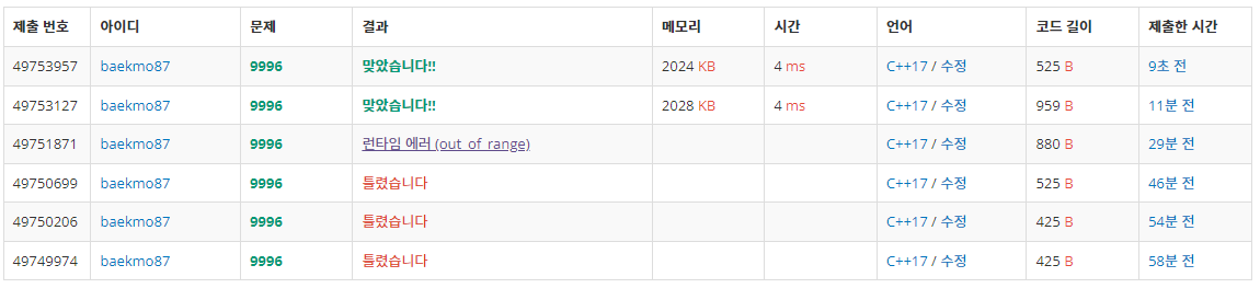 - 맨 위는 와일드카드 앞 뒤로 한 글자만 오는 게 아니라는 생각이 문득 들어서 2차시도 한 흔적이다.