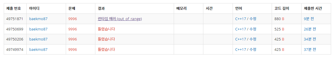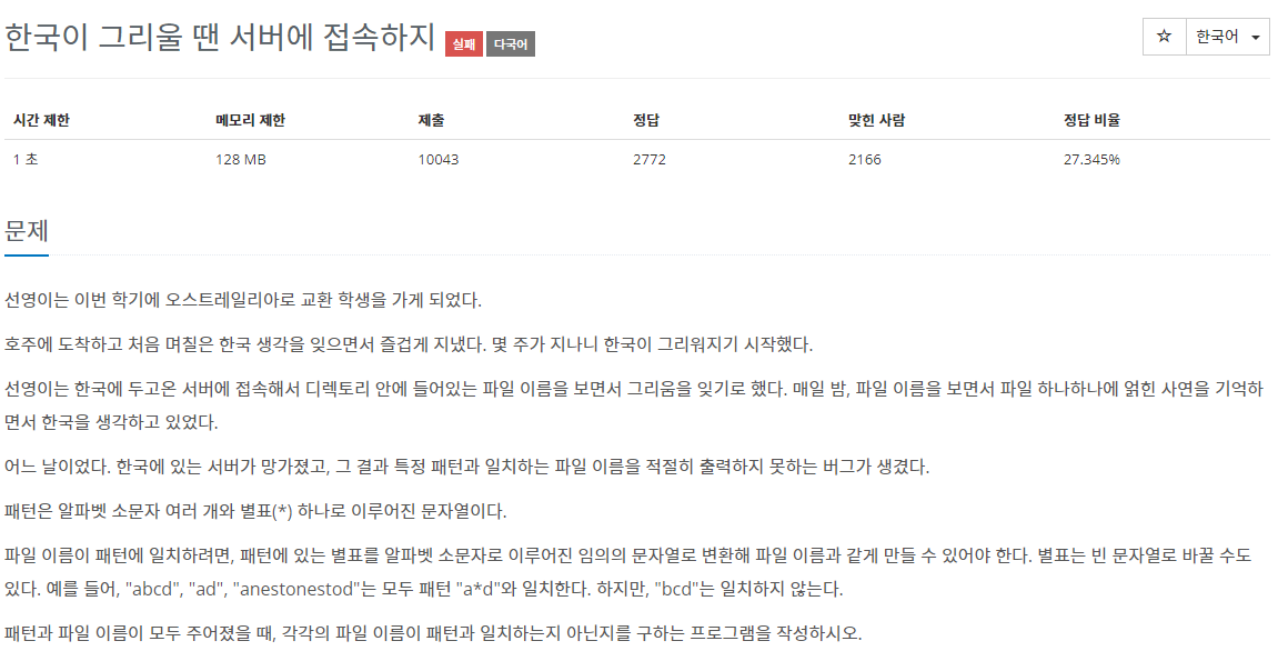 - 입력 예문에서 a*b라고 되어 있길래 * 문자 앞 뒤로 한 글자만 오는 줄 착각했던 게 화근이었다.